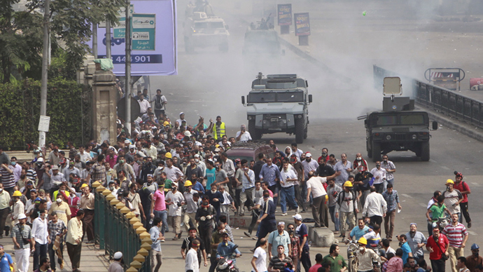 Σκηνές χάους και αίματος περιγράφουν οι ξένοι ανταποκριτές κατά την «εκκαθαριστική επιχείρηση» της αιγυπτιακής αστυνομίας. Στη μεγαλύτερη από τις δύο συγκεντρώσεις, στο τζαμί Ραμπά αλ Ανταουγία, οι δυνάμεις ασφαλείας εισέβαλαν ρίχνοντας δακρυγόνα. Στις εικόνες που μεταδίδονται, ο καπνός έχει καλύψει τις σκηνές ενώ σε ορισμένα σημεία λάστιχα έχουν πυρποληθεί. Στη δεύτερη συγκέντρωση, στο Πανεπιστήμιο, τεθωρακισμένα οχήματα μπήκαν στην κατασκήνωση.